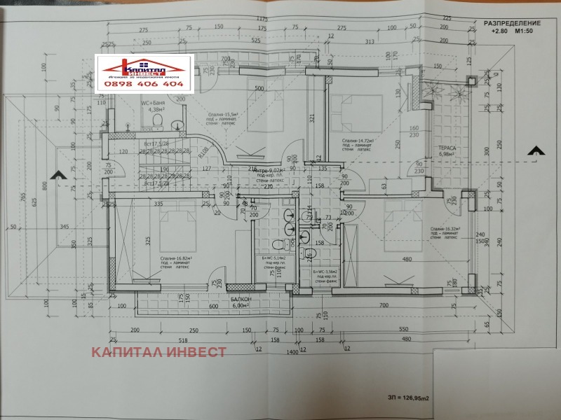 - на ниво две на площ от 126 кв.м. са разположени разпределителен коридор, три детски стаи с две бани с тоалетна, родителска стая със собствени санитарен възел и три тераси;