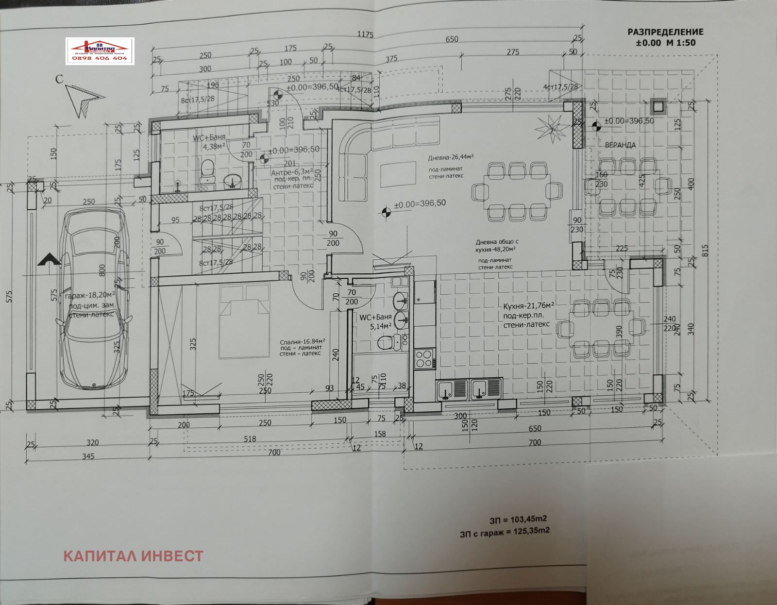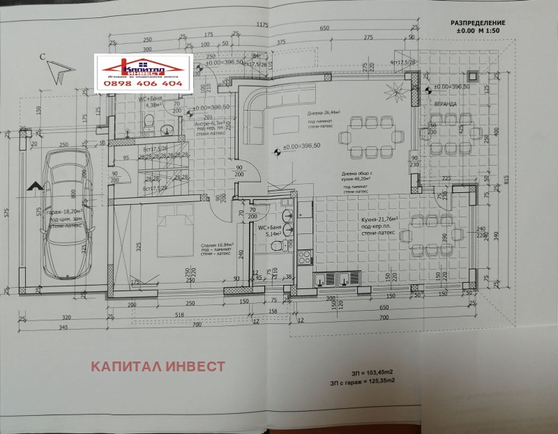 - на първо ниво на площ от 125 кв.м. са разположени- Самостоятелен Гараж, входно антре, кухненски бокс с трапезария и дневна част в едно общо помещение с достъп до дворното място, баня с тоалетна, стая за гости ( или офис със собствена баня, а може и дрешник ) и стълбищна клетка;