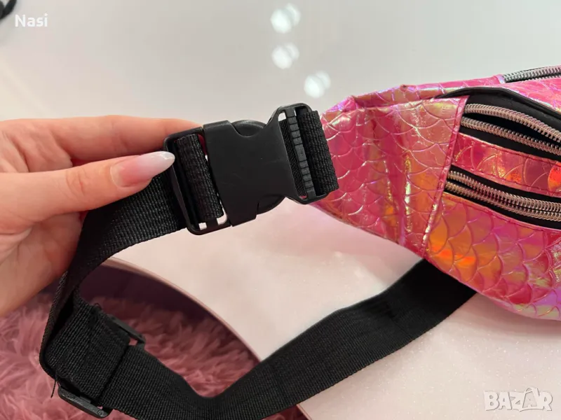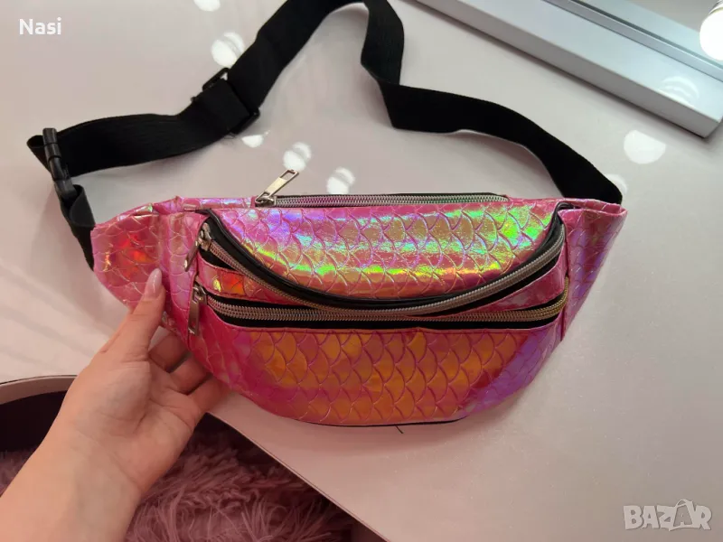 Продавам чанта тип бъбрек за кръста. Цвят хамелеон, лачена кожа. Използван е много малко. Като нов, без забележки.