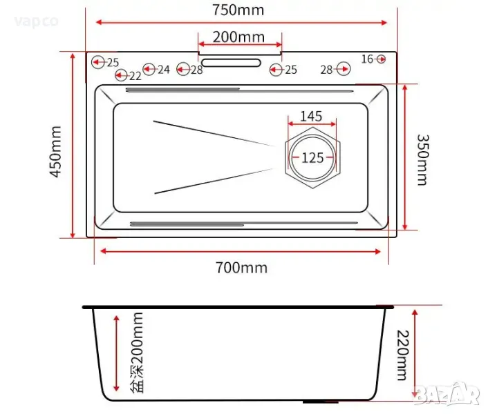 - Специална форма за оттичане на водата