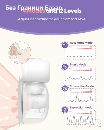 Електрическа безжична помпа за кърма с 4 режима (Стимулация, Експресия, Бионик, Автоматичен) и 12 нива на засмукване