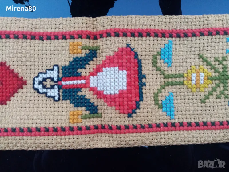Старо пано за стена - конопена основа и избродирано с вълнени конци, едър бод. С метална закачалка цвят старо злато. Размери - 98/23 см. Отлично състояние !