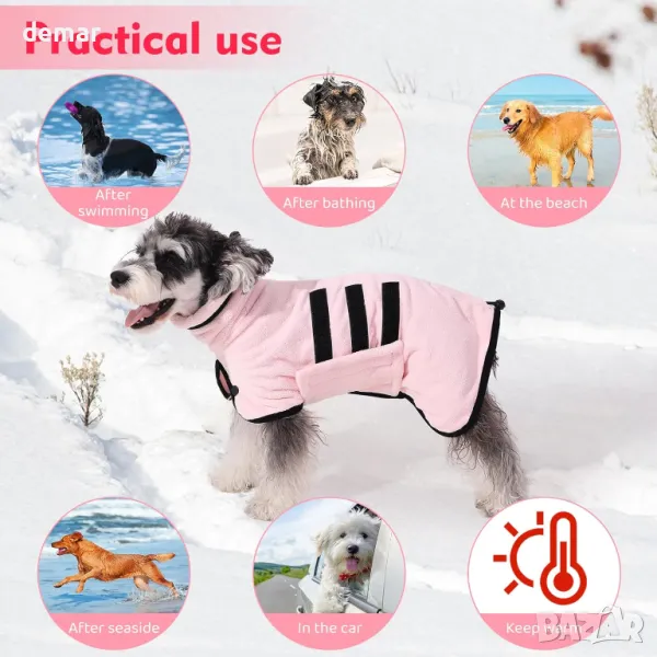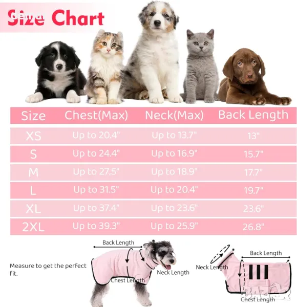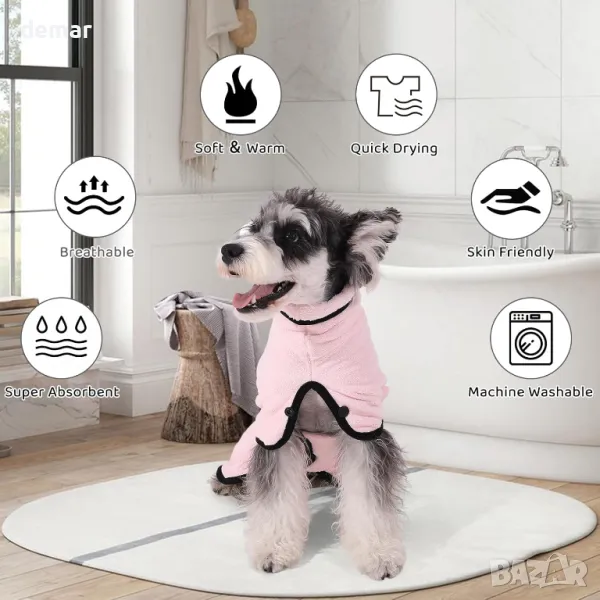 Този халат за кучета е идеален за бързо изсушаване на вашето куче след баня, плуване или разходка под дъжда. Отличава се със силна водопоглъщаемост и възможност за бързо изсъхване с регулируеми връзки за кръста и врата за плътно прилягане. Дължината на гърба и дизайнът с отворен бутон го правят подходящ за различни размери кучета, като същевременно може да се пере и в пералня за лесно почистване.