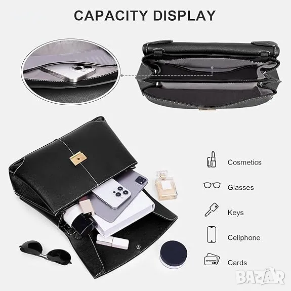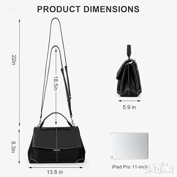 Тази универсална дамска чанта с размери 13,78x8,27x5,91 инча може да се използва като чанта за през рамо, ръчна чанта или през рамо, благодарение на подвижната си презрамка и здрава дръжка. Разполага с две вътрешни отделения, може да побере iPad и е изработен от мека, издръжлива веган кожа за луксозно усещане. Подходящ за различни поводи, той съчетава стил с практичност и предлага сигурно затваряне с копчета, което го прави чудесен вариант за бизнес или официални събития. Предлага се с торба за прах и картонена кутия за допълнително удобство.