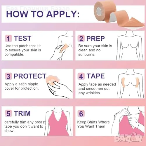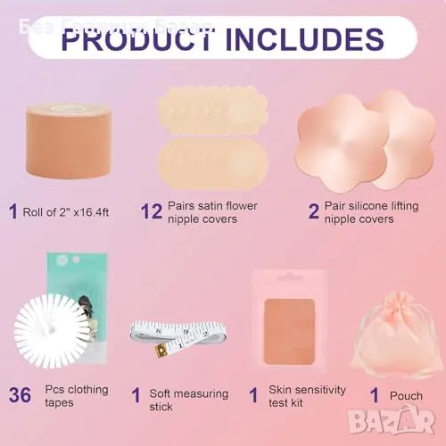 Комплект с всичко необходимо: 14 бр. капачета за зърна, Boob Tape, 36 бр. двустранна модна лента и мек метър за лесно рязане