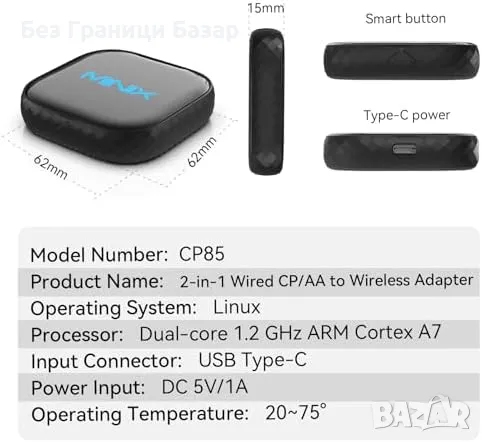 2-в-1 безжичен адаптер за CarPlay и Android Auto