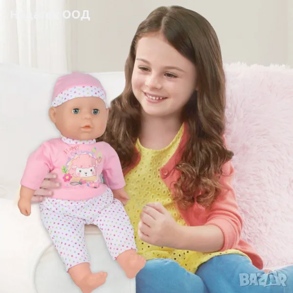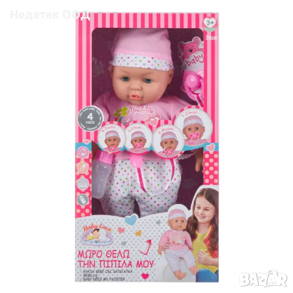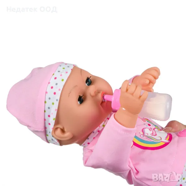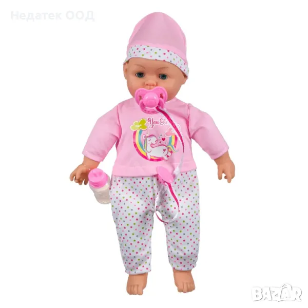 Играчка за момиче, 38см кукла бебе с биберон. Когато извади залъгалката, той казва сладки думи на английски и издава красиви звуци, а когато има залъгалката е щастлив. Той държи бутилката в ръката си, а залъгалката му е прикрепена към тениската. Работи с 3 батерии тип AG13 (включени).