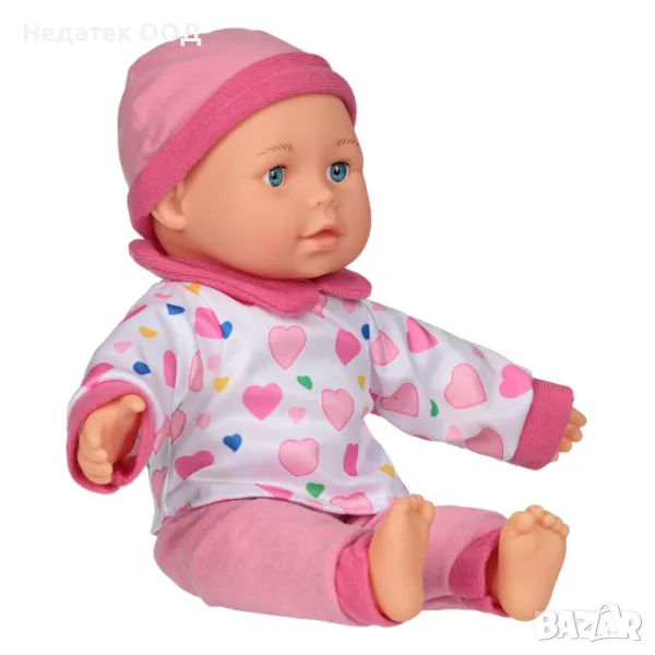 Кукла бебе с розови дрешки и дизайн на сърце, шише и розова залъгалка. Натиснете бутона на корема, за да чуете 6 бебешки звука. Работи с 2 батерии тип CR2032 (включени).