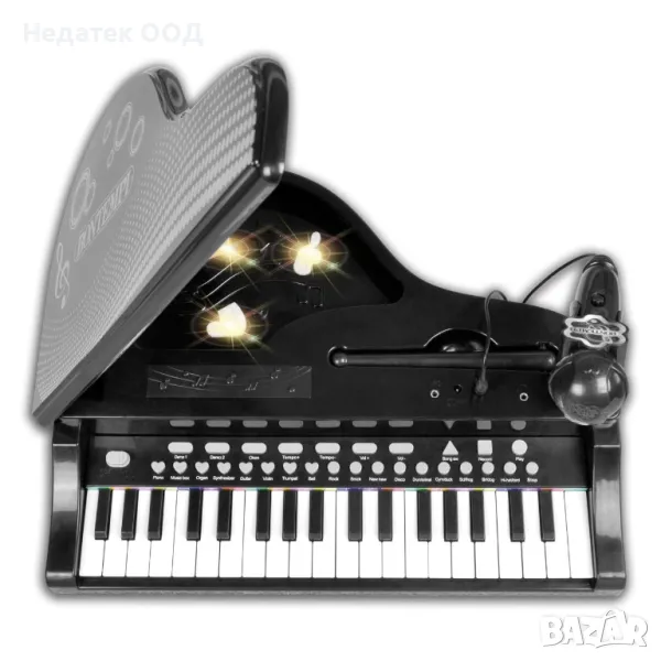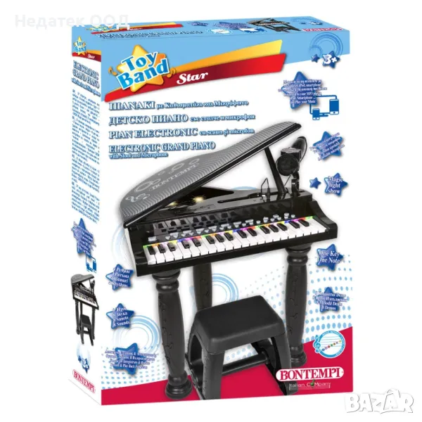Игра на пиано с контрол на звука и темпото, конектор за връзка с Mp3 плейър, смартфон и др., регулируем микрофон, жак за слушалки (не са включени), жак за микрофон, възможност за запис и възпроизвеждане на мелодия, избор на ритмични инструменти или звуци на животни и 4 ритъма с последователност. Има 8 звука и 8 демо записи. Опорните крака са разглобяеми. Работи с 4 AA батерии (не са включени).