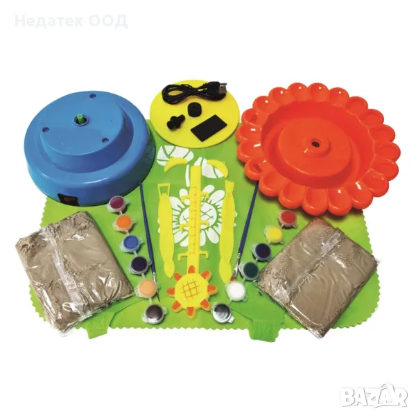 Грънчарска работилница с грънчарско колело 17,5x8 см, захранвано от 1 м USB и специална приставка за поддържане на детски ръце. Съдържа 900 g глина, цветова палитра и 12 саксии с бои, 2 инструмента за скулптуриране, режещо въже с дръжки, 2 четки за рисуване, престилка и 8 стикера за украса на вашите творения. Колелото се захранва от USB или 4 D-тип батерии (не са включени).Грънчарството с колело съчетава развитието на креативността и когнитивните умения. Този комплект укрепва фината моторика и координацията око-ръка, докато детето се забавлява и повишава креативността си. Децата сами създават дизайни с въображението си и по този начин се засилва усещането за успех.