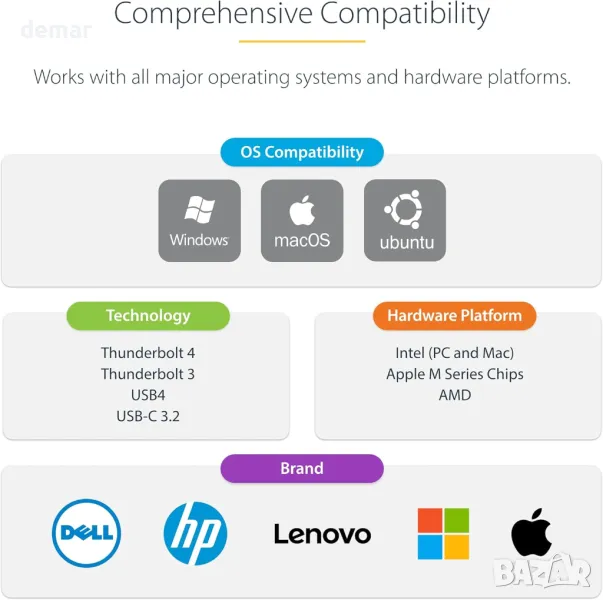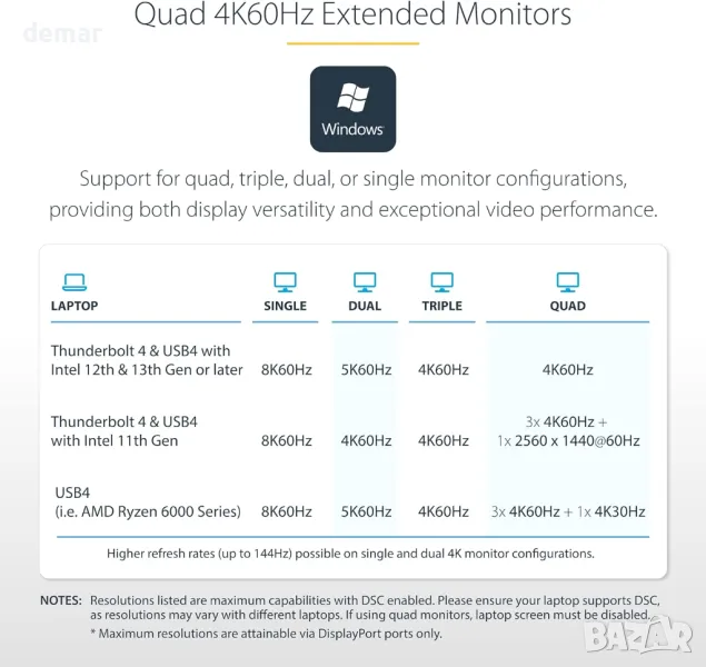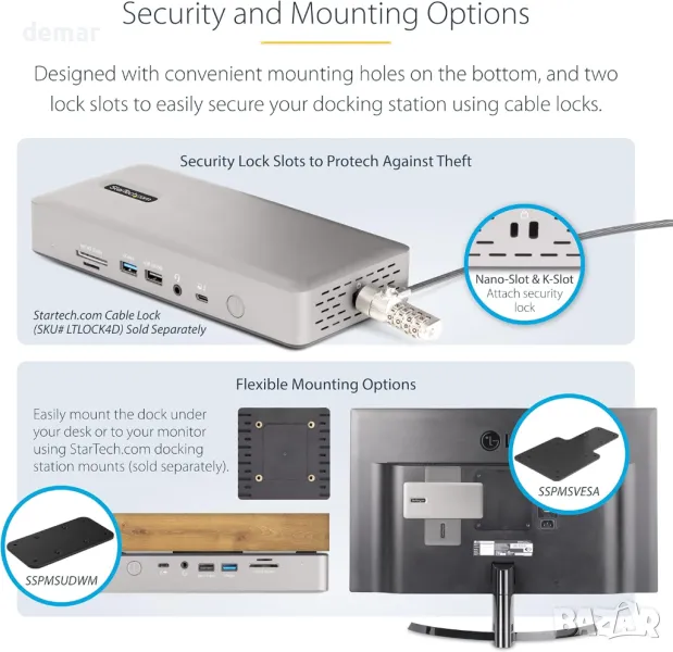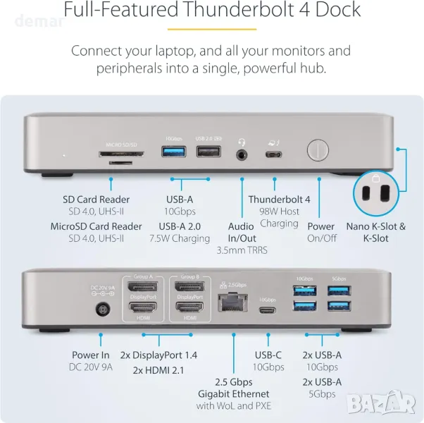 Тази докинг станция Thunderbolt 4 предлага настройка без драйвери с гъвкавост на няколко монитора, поддържаща до четири 4K 60Hz дисплея със съвместими процесори на Intel и единичен HDMI дисплей до 8K 60Hz. Той разполага с 2x DisplayPort, 2x HDMI, 7-портов USB хъб, четци за SD/mSD карти, 2,5GbE и 3,5 мм жак за слушалки. Съвместим с Windows, macOS и Ubuntu, поддържа четворни дисплеи на Windows и двойни дисплеи на MacBook Pro. Докинг станцията осигурява доставка на мощност от 98 W и включва 1m TB4 хост кабел, K-слотове за заключване; Софтуер за инструменти за свързване с MAC Address Pass-Through, USB Event Monitoring, WiFi Auto Switching & Windows Layout помощни програми.