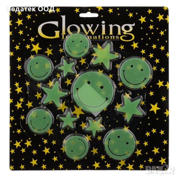 Флуоресцентни стикери за стена с усмихнати лица и дизайн на звезди. Поставете ги в източник на светлина за минута, за да запазите блясъка. Залепете ги с двустранната лента, включена в опаковката, към стената или тавана, за да създадете невероятен блясък. Те са изработени от пластмаса и лесно се отстраняват за повторна употреба и ви позволяват да промените сцената незабавно. Можете да ги залепите върху предмети или прозорци.Предупреждение: Потенциално отстраняване на боя при отлепване от стената. Продуктът е само за декоративна употреба. Пазете го далеч от деца.