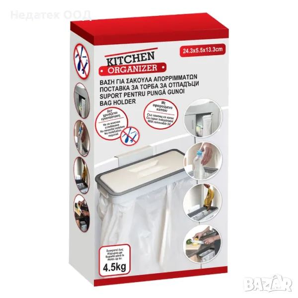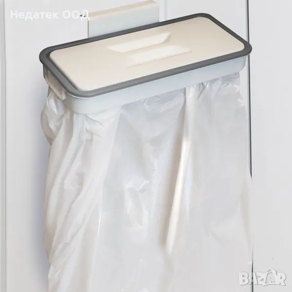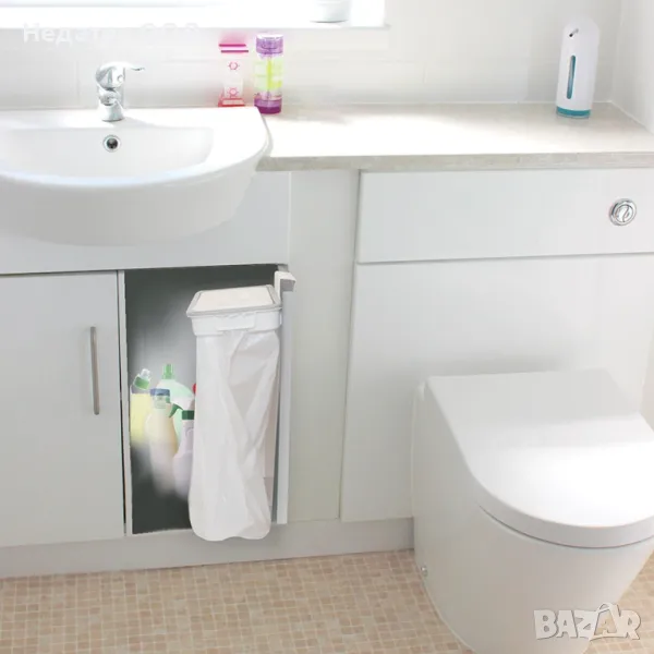Основа за торба за боклук пластмасова бяла с капак. Не е необходим монтаж, просто прикрепете към чекмедже или шкаф, поставете чантата и затворете с капака. Идеален за малки кухни.