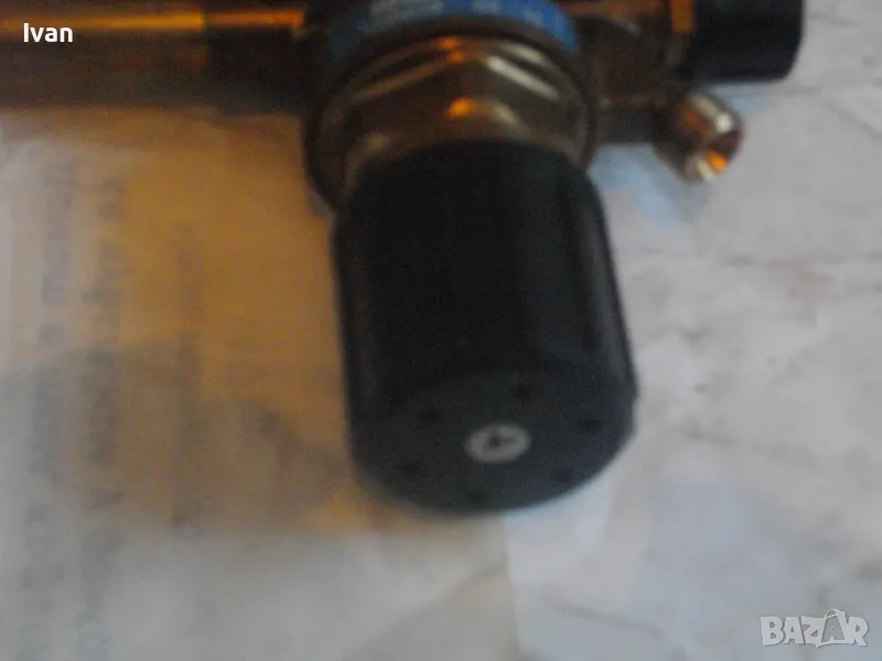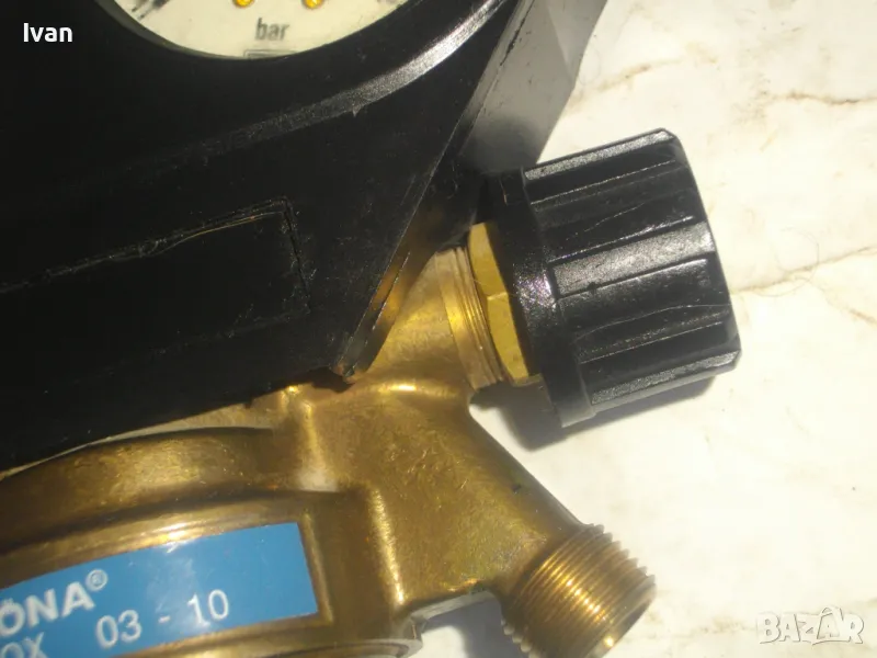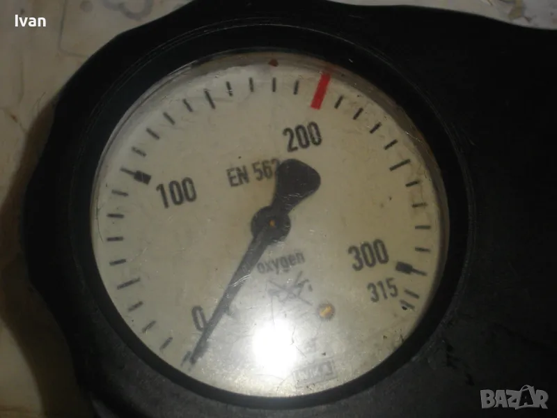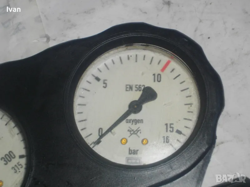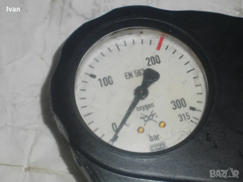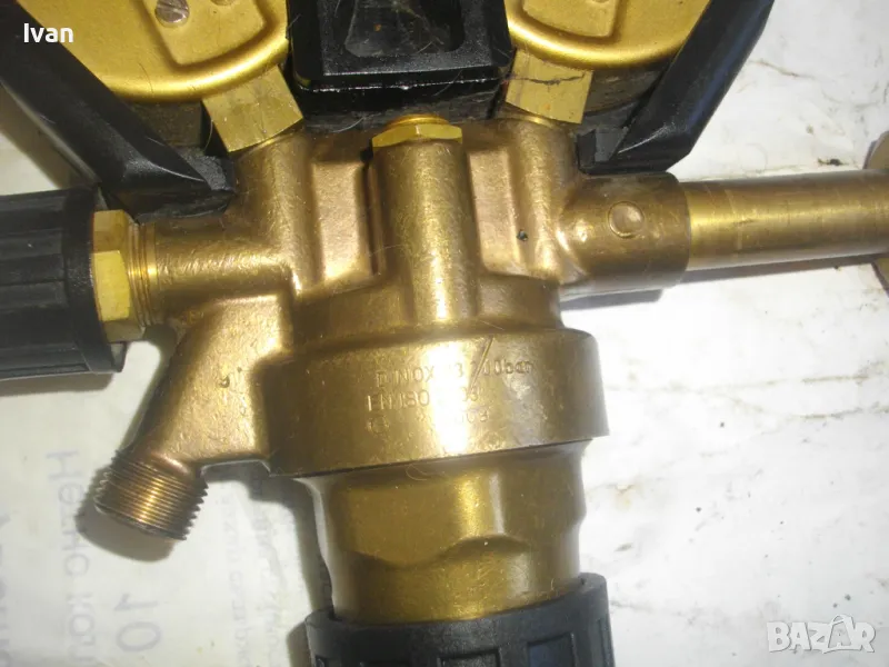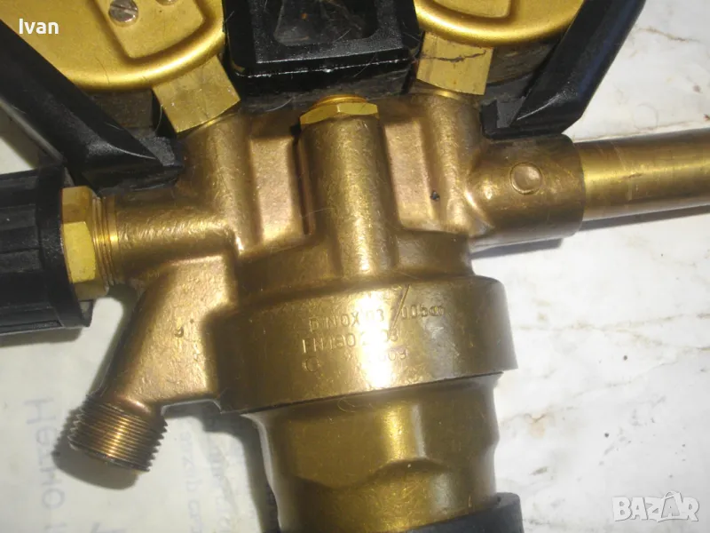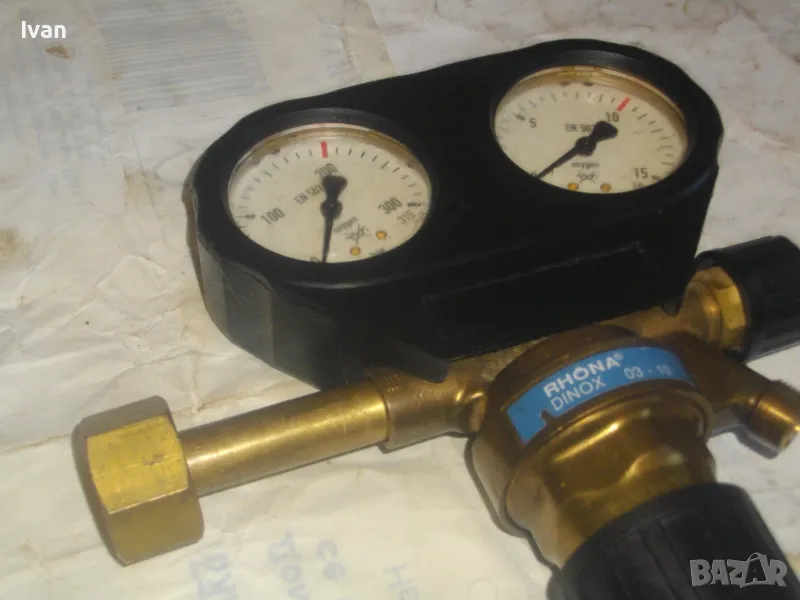 ОПИСАНИЕ на редуцир вентил за кислород с черна защитна гума. Немски оригинален, почти нов, висок клас, професионален. Марка и модел RHONA Dinox 03-10. Бронз изцяло, долен спирателен кран, десен върток реглаж. Защитна гумирана инпрегнирана вложка на манометрите. Манометри - оригинални WIKA OXYGEN 0-315 bar и 0-16 bar. Вентила е с маркировка за нялягане до 200 бара. Вентила е като нов/трудно различим от нов. Тегло - 2,0 кг.