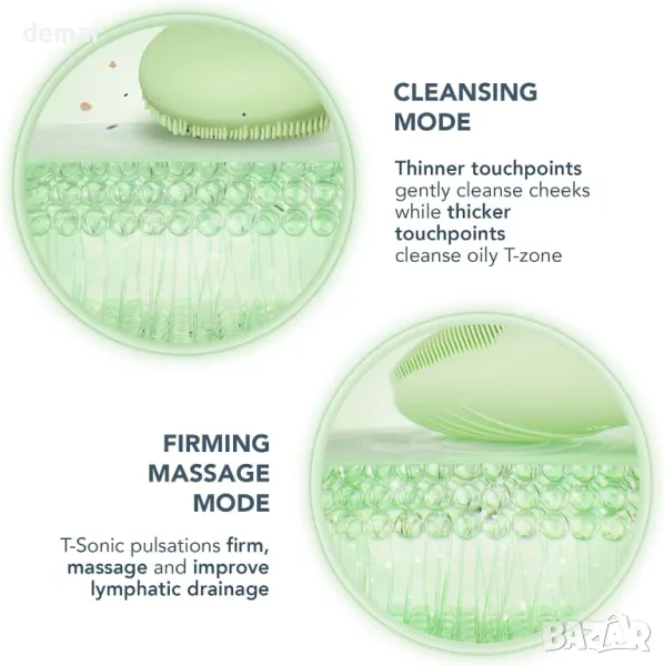 Двузоновата глава на четката с 8 T-Sonic интензитета на пулсация ефективно премахва 99,5% от мръсотията, маслото и грима само за една минута, като предлага дълбоко почистване и целенасочен стягащ масаж. Изработен от ултра-хигиеничен силикон, той е 35 пъти по-хигиеничен от найлоновите влакна, осигурявайки минимален пренос на бактерии. Тази мека силиконова четка подобрява усвояването на продуктите за грижа за кожата за максимална ефикасност. Идеален за ежедневна употреба, съчетава се добре с пенливи почистващи препарати за оптимални резултати.