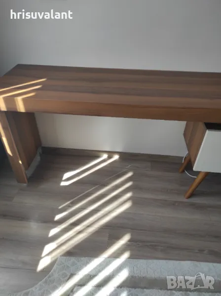 Секцията е от МДФ и боядисан МДФ крем мат. Обща дължина около 250 см , може да се размине малко повече или по- малко, защото бюрото е стъпило от едната страна върху другия елемент. Няма забележки секцията. Отпред е с два рафта . Височина на ниския модул 63 см. На бюрото 78. 5 см. Има възможност, краката на бюрото да се махнат, защото са слагани допълнително. Тогава височината ще е 70 см. Ширина 50см , Дължина 140 см. Ниския модул е 124 см На 40 см на 63 см височина .