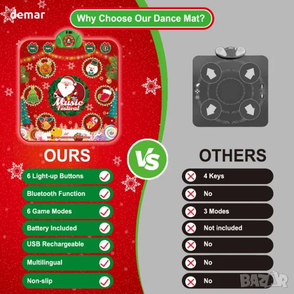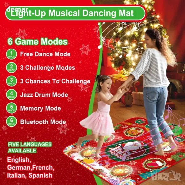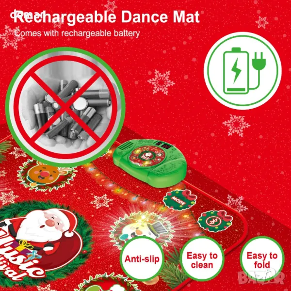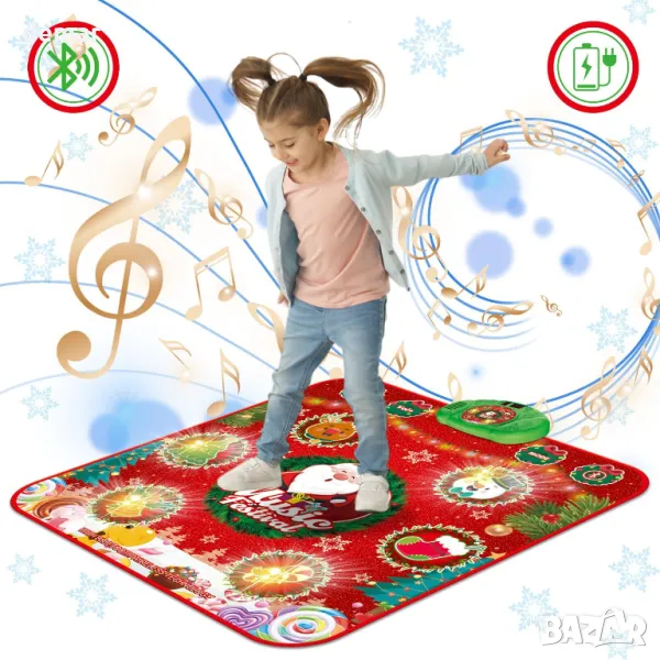 Светещата подложка за танци с коледна тематика включва празнични шарки, които светят, добавяйки към празничното забавление. С множество танцови режими, включително свободна игра, нива на предизвикателство, звуци на джаз барабани и режим на памет с 30 нива, той предлага интерактивно изживяване за децата. Новодобавената Bluetooth функция позволява на потребителите да свързват любимите си песни, докато пет езикови опции я правят гъвкава. Подложката е презареждаема, неплъзгаща се и сгъваема за лесно транспортиране и съхранение. Това е забавен начин за децата да спортуват, да подобрят координацията и е отличен подарък за различни поводи като Коледа, рождени дни и празници.