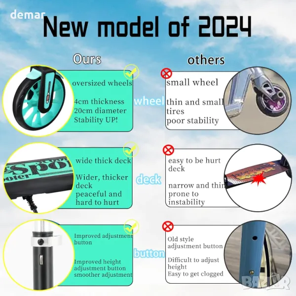 Тази тротинетка е предназначена както за деца, така и за възрастни, с регулируеми дръжки (88 см, 95 см, 102 см), за да се адаптира към различни височини. Издържа до 100 кг, осигурявайки издръжливост и дълготрайна употреба. Здравата 5 кг рамка предлага стабилност, докато 8-инчовите колела и пружините на окачването осигуряват гладко возене, дори и по неравни повърхности. Безопасността е подобрена с ръчна и задна крачна спирачки, а сгъваемият дизайн и стойката на скутера го правят лесен за транспортиране и съхранение. Идеален за свободното време или практическа употреба, идеален за кратки пътувания и подобряване на баланса.
