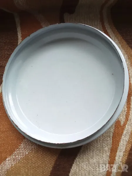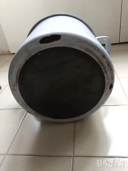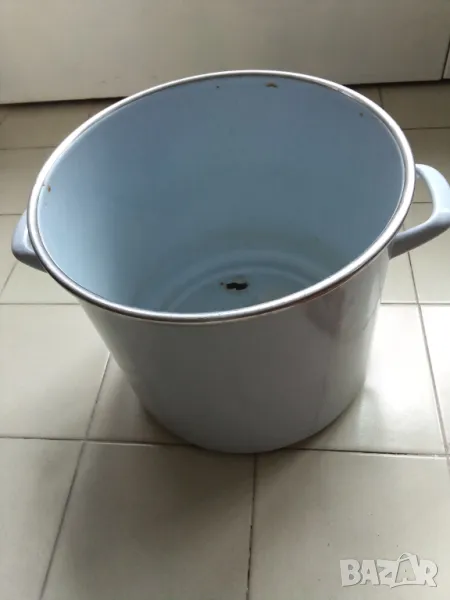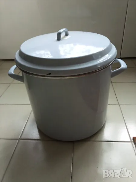 Голяма стабилна,висока, емайлирана тенджера с капак. Доста тежка, с подсилено дъно. Има чукнато на дъното, вижда се на снимката..