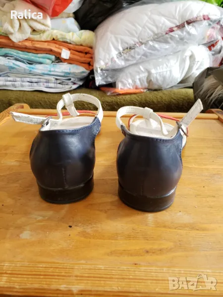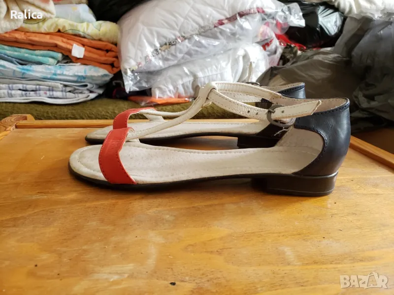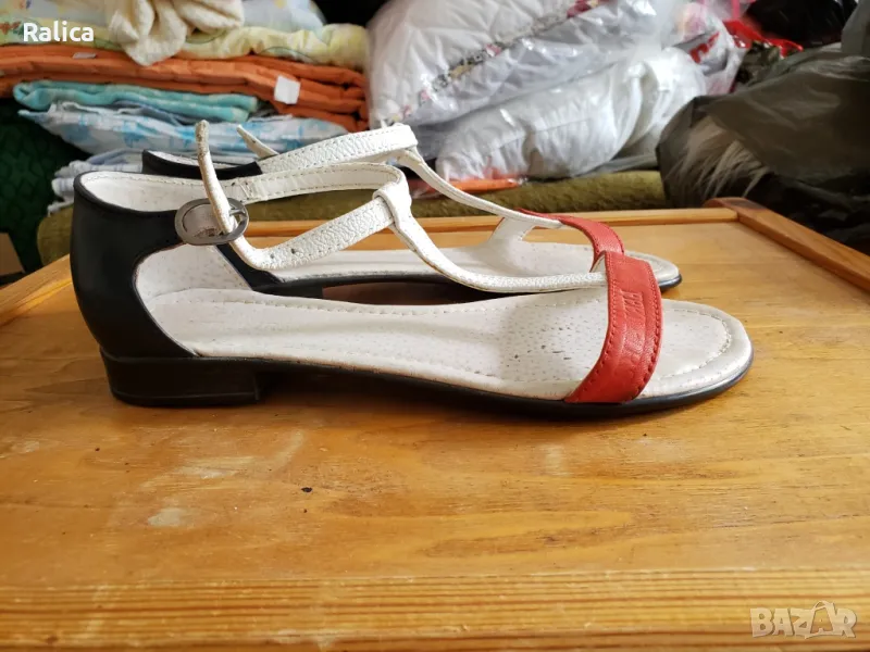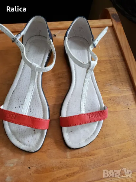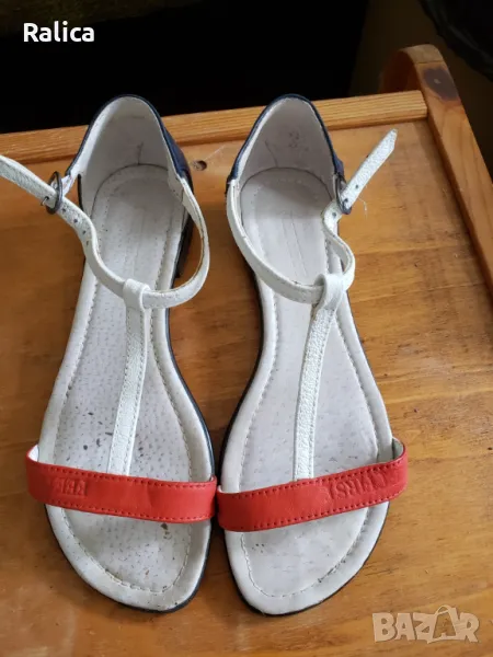 Сандали естествена кожа с тънки каишки. Синьо, бяло и червено. Стелката също е естествена кожа. Много удобни. Нямат забележки.