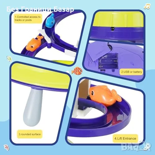 Комбинирана писта с асансьор за рибки, които се движат по спираловидна стълба