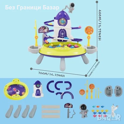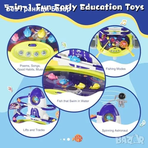 Синя играчка за риболов с форма на космическа капсула и въртящ се астронавт