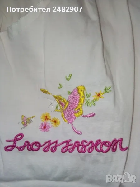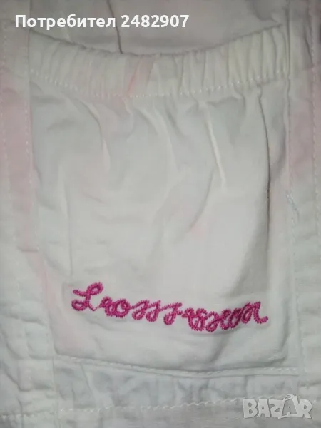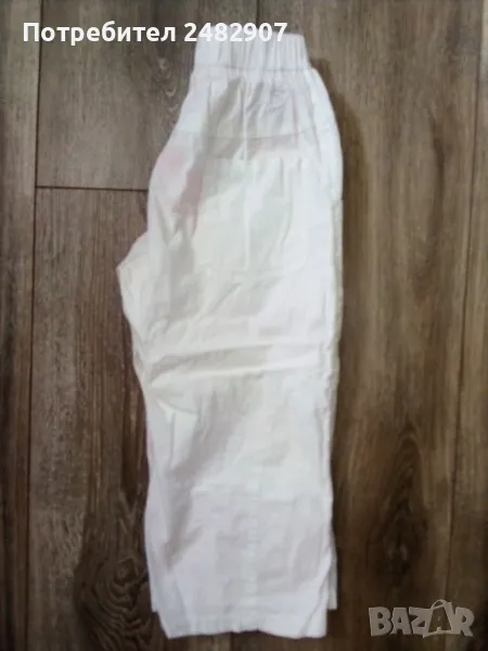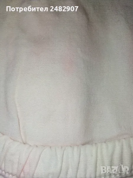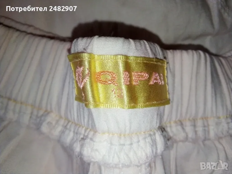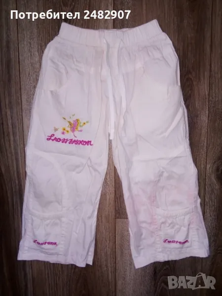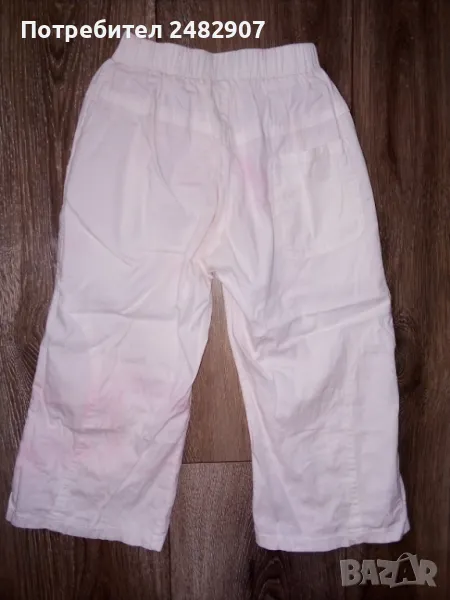 Детски панталон за момиче с ластик в талията, джобове и връзки. Ширина в талията - 20 см, дължина от талията до чатала - 19 см, дължина от талията до долу - 51 см, ширина на крачола в долната част - 18 см. Много запазен, почти не е използван, оцветен при пране в розово.