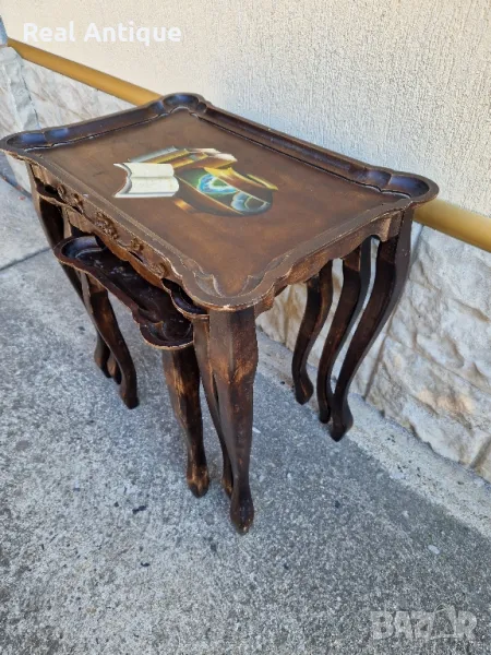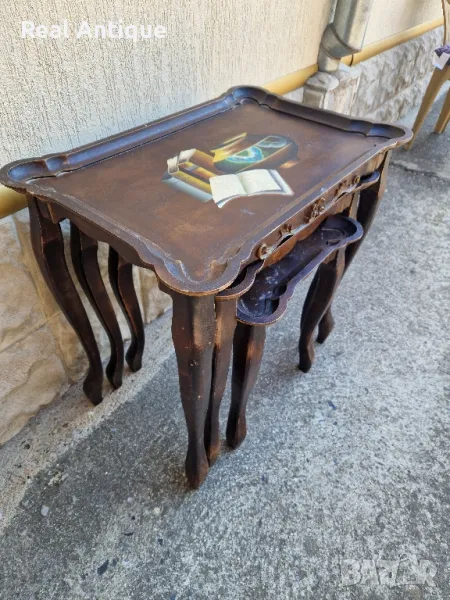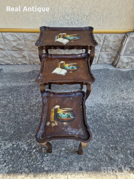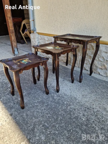 Продавам комплект от три броя антикварни масички в много добро състояние. Размери на голямата 60 см на 40 см на 60 см - средната 52 см на 48 см на 40 см и малката 45 см на 40 см на 35 см. Прекрасно допълнение към интериора на Вашия дом офис вила механа. Работя с всички куриери. Отговарям бързо.