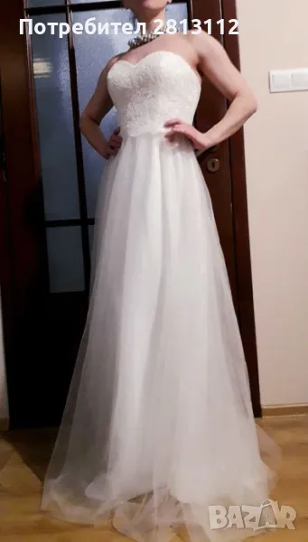 Разкошна сватбена рокля Magic night. Нова с етикет. Размерът е Xs, но е малко уголемена, така че става за S. Дължината на роклята - 140 см. Модел 2021 год. в силует Princess - корсетна дантелена горна част с малки перли и пищна широка долна част с два слоя тюл и два слоя плат от копринен сатен. Този образ като никой друг подчертава женствеността и изтънчеността на булката.