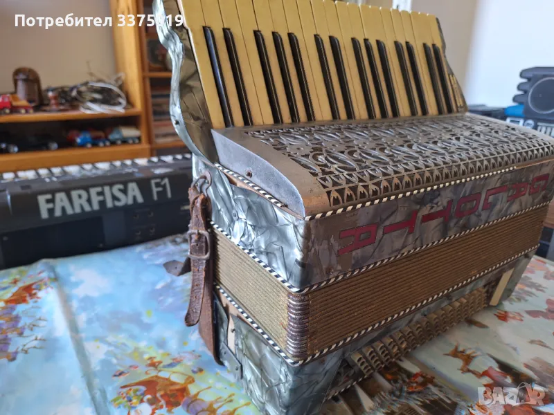Акордеона има забележки. Подходящ за части или декорация. Може и да се реставрира.80баса здрави баси и клавиши.Лично предаване.