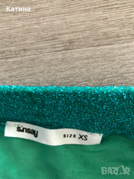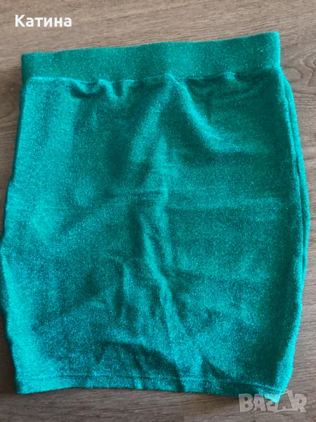 Стрхотен блещукащ сет.Черен топ Bershka,със сребриста ламяна нишка.Размер S.Sinsay блещукаща еластична пола,в синьо-зелен цвят.Размер ХS.Обличани 1-2 пъти.Като нови.