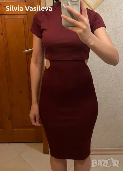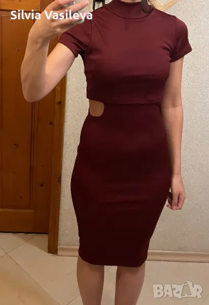 Рокля в бордо с изрязани участъци на кръста. Дължина под коляното.