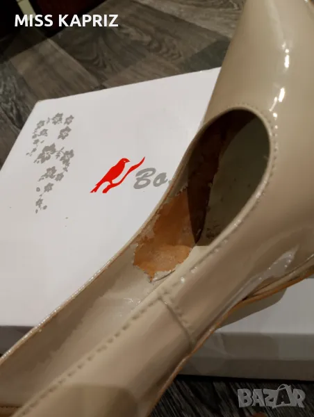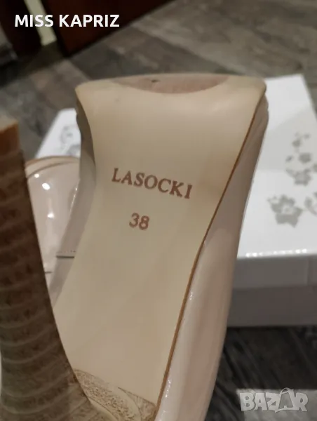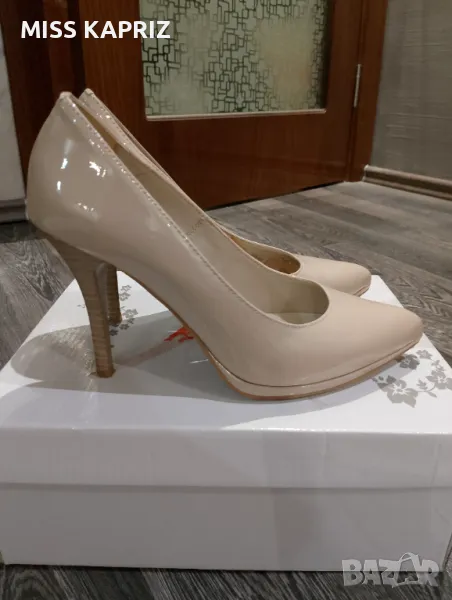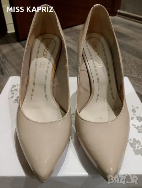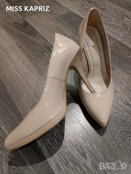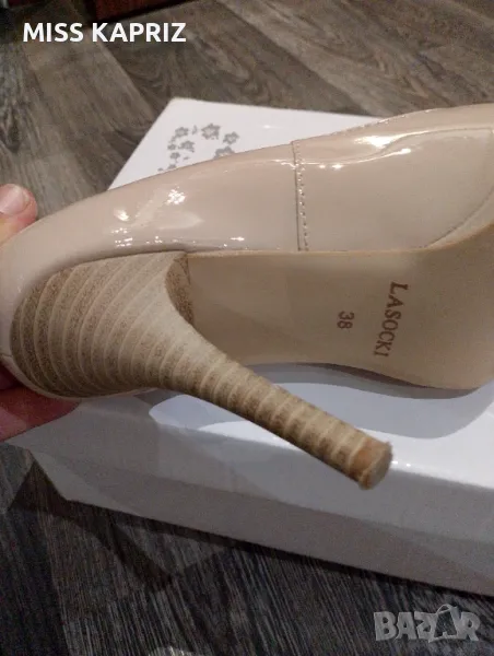 Дамски елегантни обувки на ток 10см LASOCKI, бежов лак,ток имитация на дърво,лека забележка от вътрешната страна се е обелила кожата