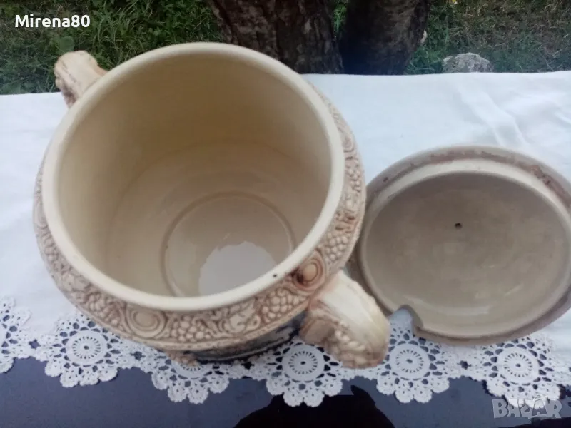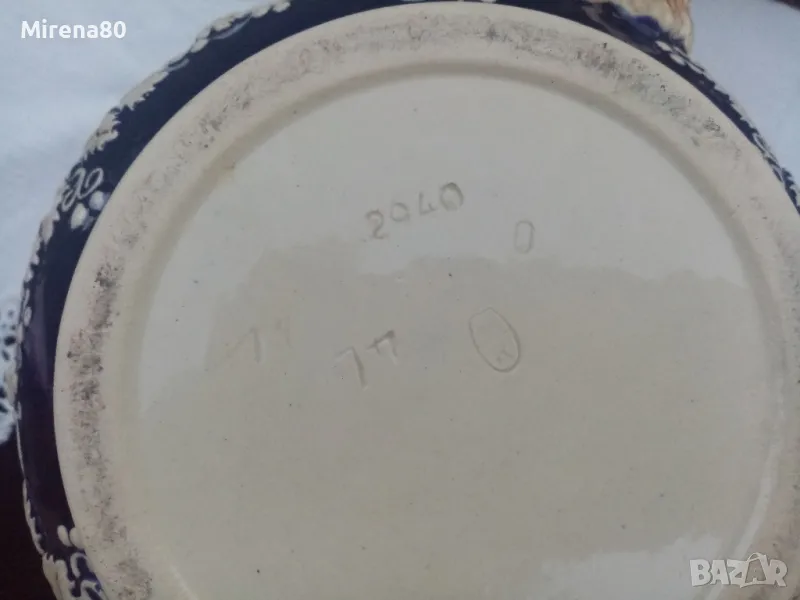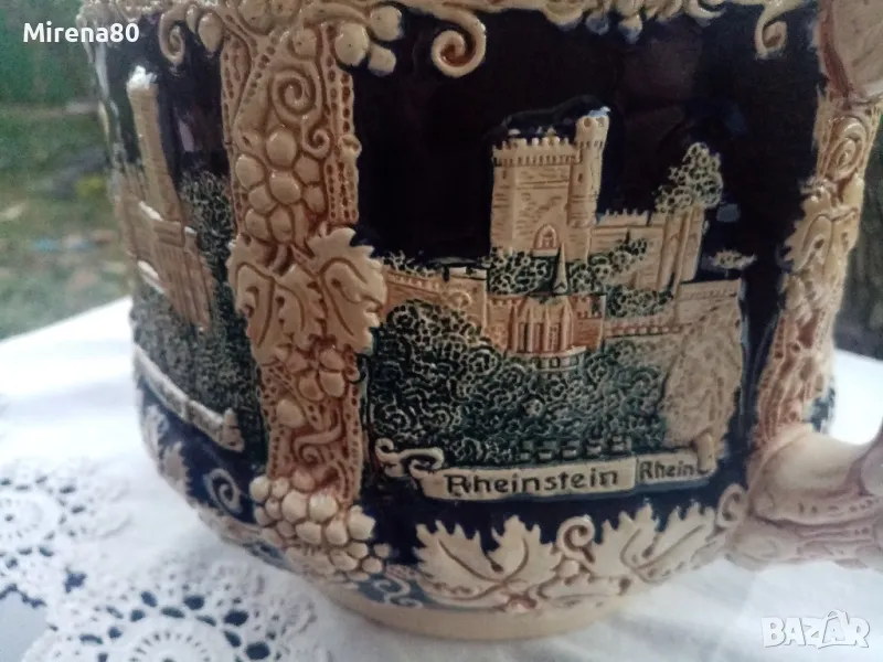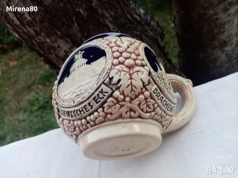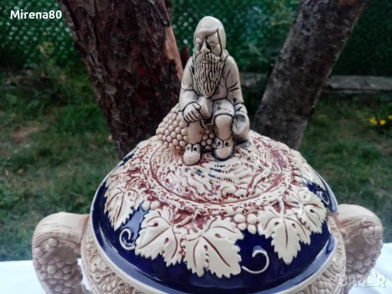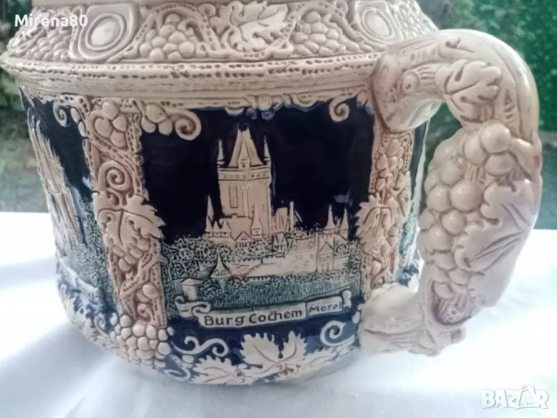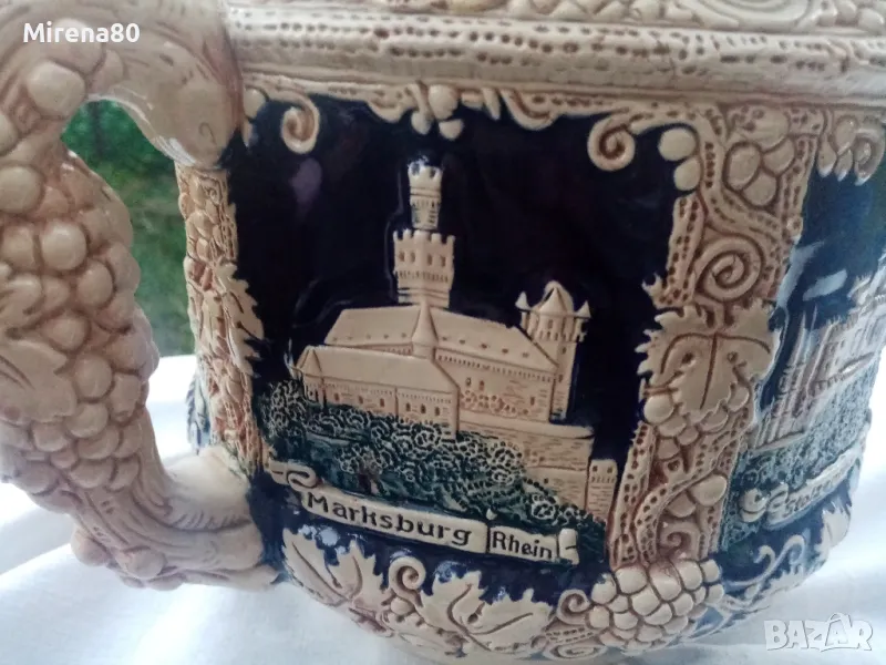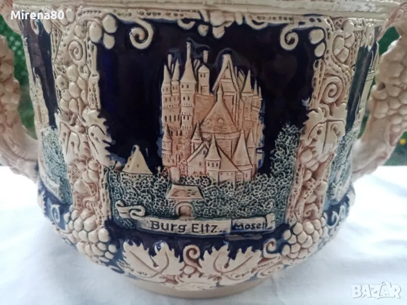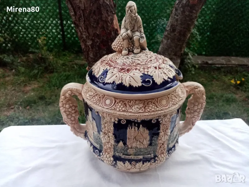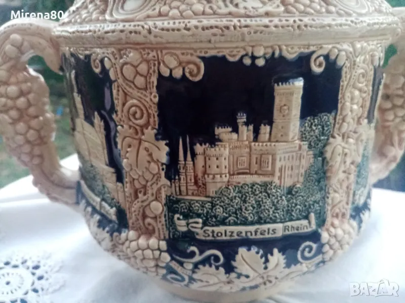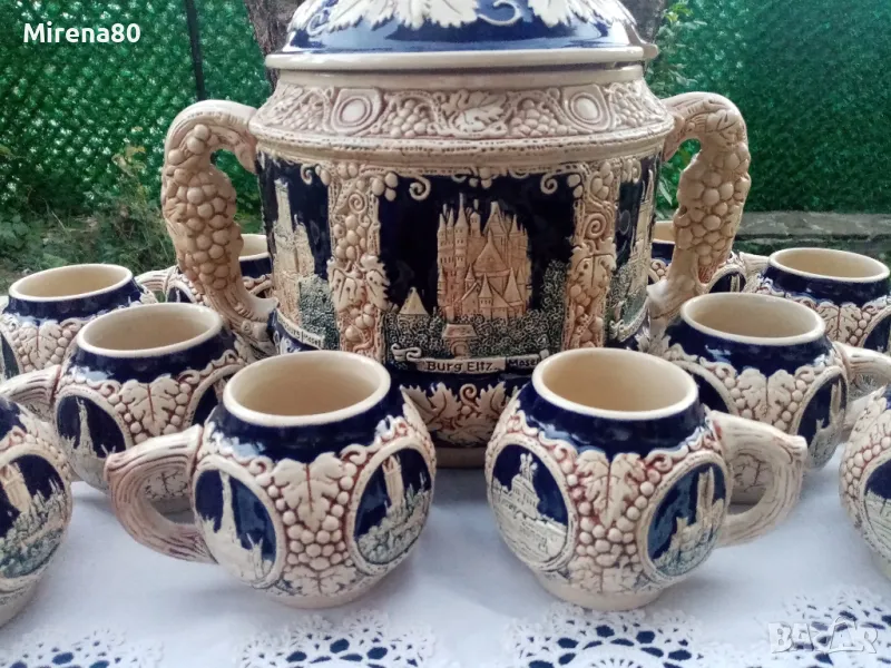 керамика, в абсолютно запазено като ново състояние - без никакви следи от употреба. Най-вероятно е красял нечия витрина....Огромен съд за греяно вино (над 4 литра) с капак и 6 чаши (вмест. 250 мл). Невероятен релеф на съдовете, покрити с истински кобалт и декорирани с известни немски замъци. Наистина впечатляваща вещ, за ценители !