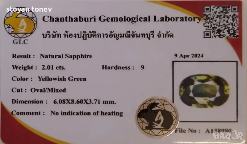 Естествен сапфир с тегло 2.01кт и произход Мадагаскар. С чистота VVS без никакви включения видими с невъоръжено око. Цвета е жълто зелен. Класически овал с размери: 8.60 х 6.08 х 3.71mm.