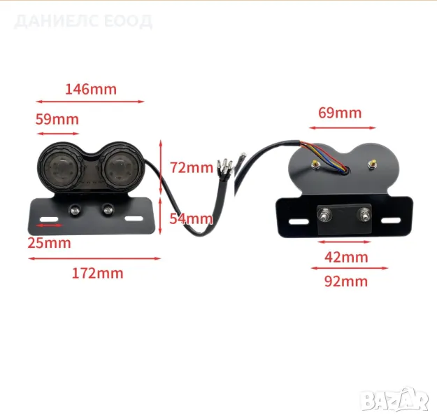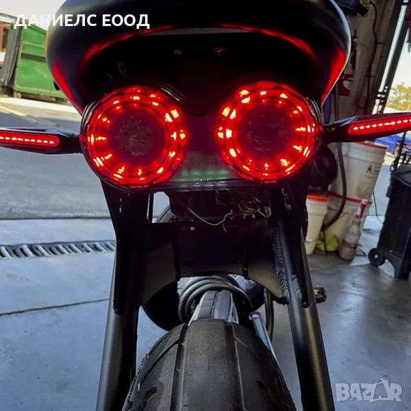 Стоп диоден за мотоциклет с вградени мигачи и стойка за номер.