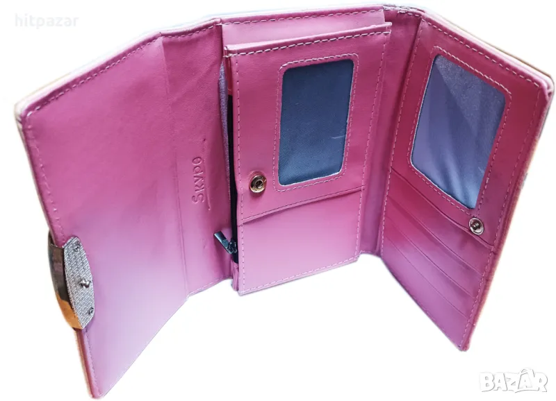 Портмонето е тройносгъваемо и се разтваря напълно. Вътре портмонето вътре е с три раздела единият, от които е с цип. Портмонето има също и място за лични документи и банкови карти.