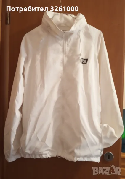 Непромокаемо, олекотено. Закопчаването е с цип. Качулката може да се прибира с цип. Отдолу якето е с връзки за регулиране на широчината. Оригиналният размер посочен на якето е L. Отговаря на размер 42 EU, 48 БГ номерация. Външната страна на якето е от полиестер. Отвътре е памук. Дължина на якето - 66 см. Гръдната обиколка на якето е 116 см. Якето е в отлично състояние.