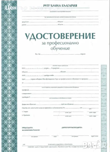 държавно СВИДЕТЕЛСТВО ЗА ПРОФЕСИОНАЛНА КВАЛИФИКАЦИЯ по образец 3-54 на МИНИСТЕРСТВО НА ОБРАЗОВАНИЕТО И НАУКАТА;