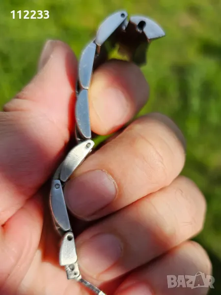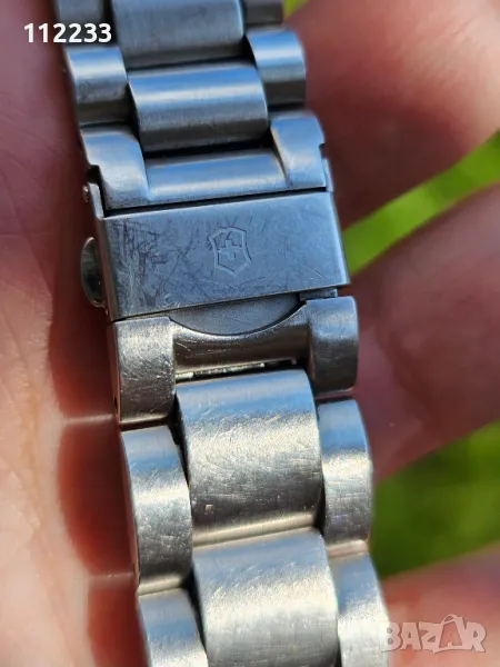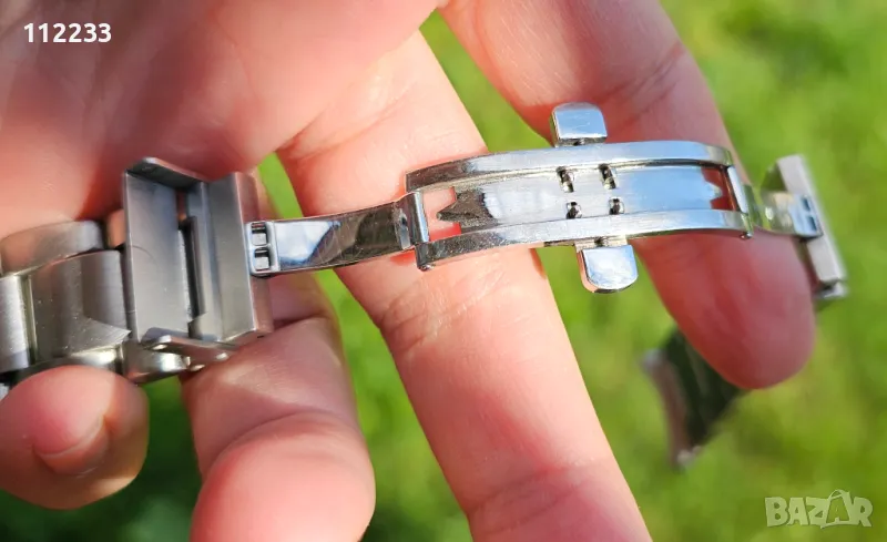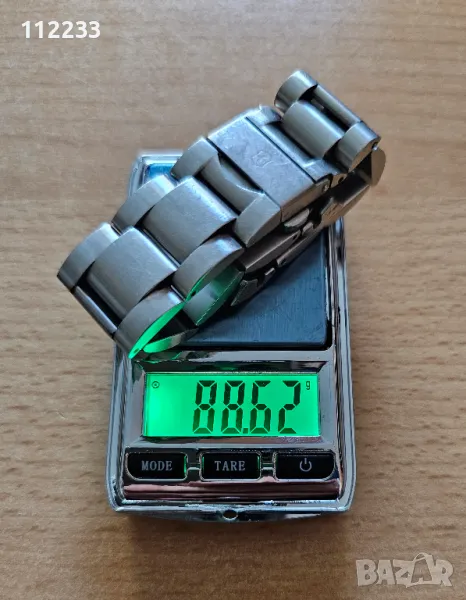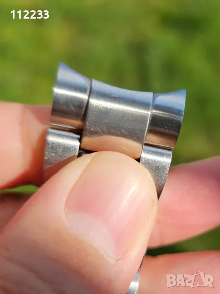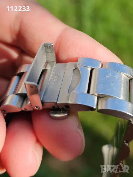 Здрава,плътна и тежка верига от стомана,която няма нужда от представяне. Има следи от употреба,но само драскотини и ако се полира,ще лъсне. Липсват звена и като се сложи на часовника е за по-тънка китка 18-19 см. Самата верижка е 15,5 см дълга.Междулъгово разстояние 23 мм.