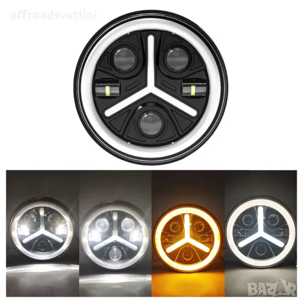 Комплект от 2бр. универсален 7" инча 18см ЛЕД LED фар лампа халоген 12V-24V къси/дълги с DRL дневни светлини мигач бяло-жълто 12000lm за АТВ джип мотоциклет камион трактор и др