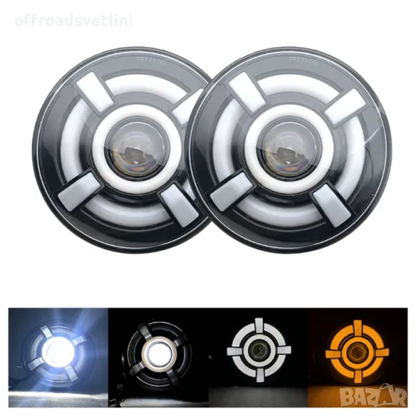 Комплект от 2бр. универсален 7" инча 18см ЛЕД LED фар лампа халоген 12V-24V къси/дълги с DRL дневни светлини мигач бяло-жълто 12000lm за АТВ джип мотоциклет камион трактор и др