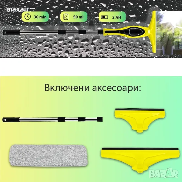 Чрез акумулаторната стъклочистачка Luna 100 Pro – Акумулаторна стъклочистачка можете да почистите лесно и удобно прозорци, стъкла, огледала, плочки. Ергономичният дизайн осигурява широкообхватно почистване без остатъци от вода. Уредът за почистване на прозорци разполага със 120-сантиметров удължител, който Ви позволява да достигнете и до най-недостъпните места. В комплекта е включен пулверизатор за 270 мл течност + накрайник с моп за разнасяне на препарата + два накрайника на стъклочистачката.