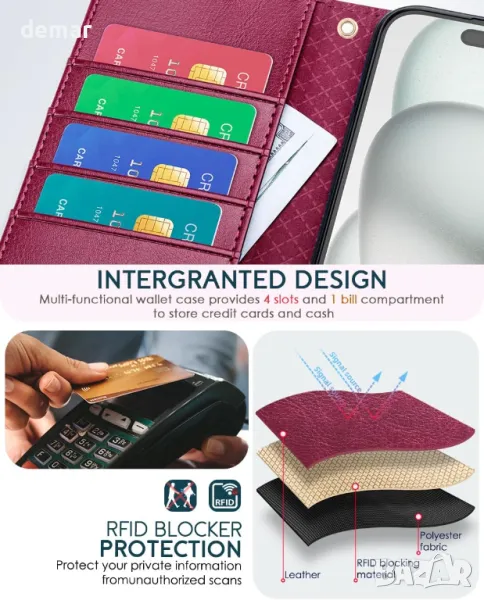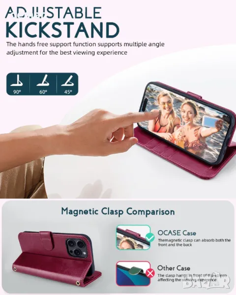 OCASE Кожен калъф за iPhone 16 Pro Max с каишка, стойка, портфейл с RFID блокиране, бордо