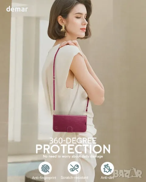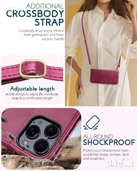 Този калъф е проектиран специално за iPhone 16 Pro Max (6,9-инчов дисплей, издание 2024 г.). Разполага със сваляща се презрамка, която ви позволява да го носите като чанта през рамо или през рамо за удобство без ръце, идеално както за мъже, така и за жени. Калъфът включва 4 слота за карти, отделение за портфейл и магнитно затваряне с RFID екраниране, за да предпази вашите карти от кражба на данни. С TPU вътрешна защита, повдигнати ръбове и прецизни изрези, той предлага пълна защита и лесен достъп до всички функции. Изработен от първокласна PU кожа, той е издръжлив, устойчив на надраскване и стилен.