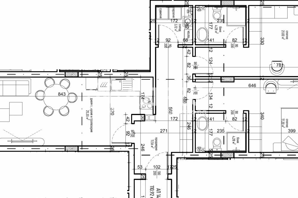 Тристаен апартамент на етаж ТРЕТИ със ЗП- 110.92м2, РЗП- 131.05м2 и разпределение: антре, дневна с кухненски бокс и трапезария, две спални, две бани с тоалетни, килер/мокро и два балкона. Изложение ЮГ. Налични подземни гаражи с монтирани врати, собствен електромер и три контакта.