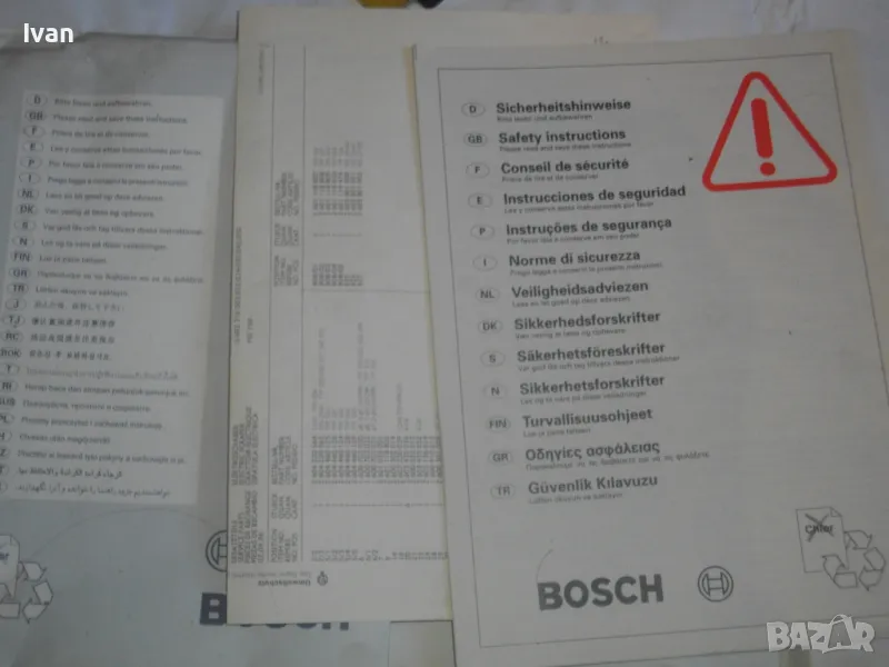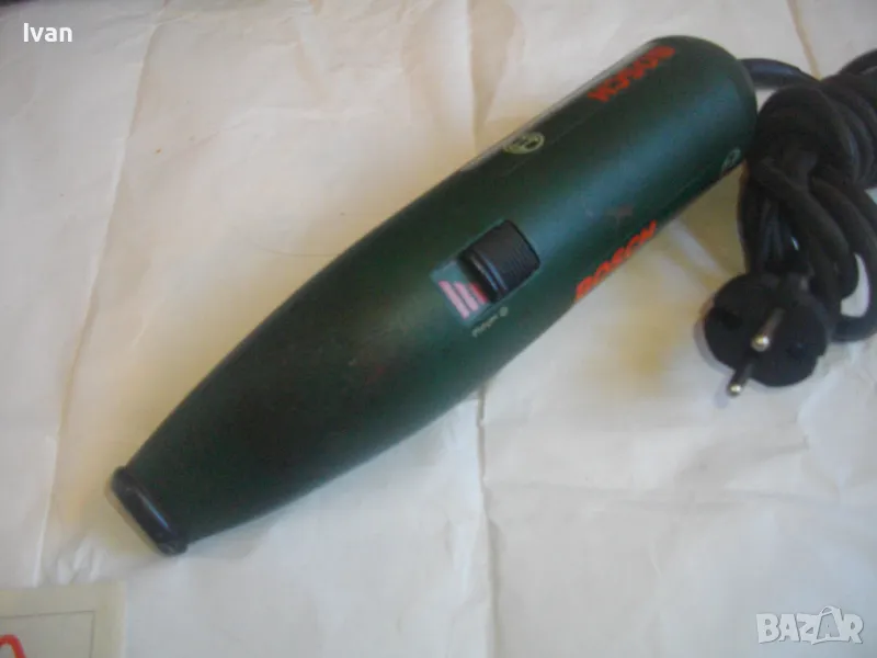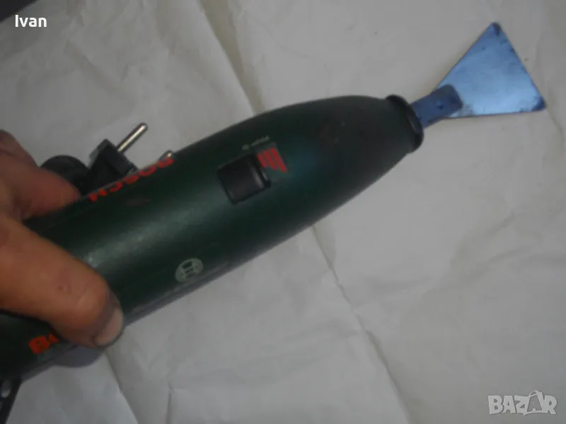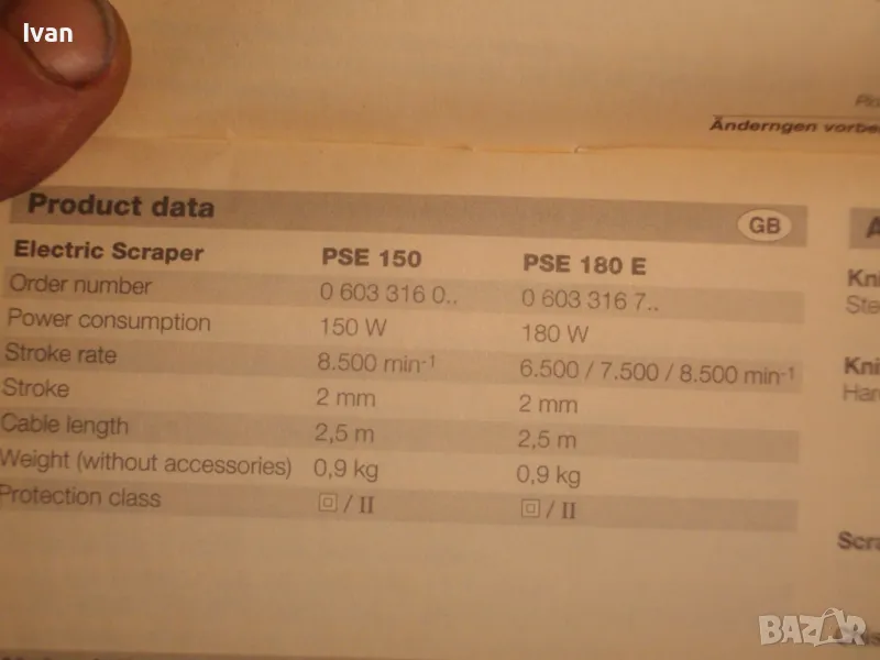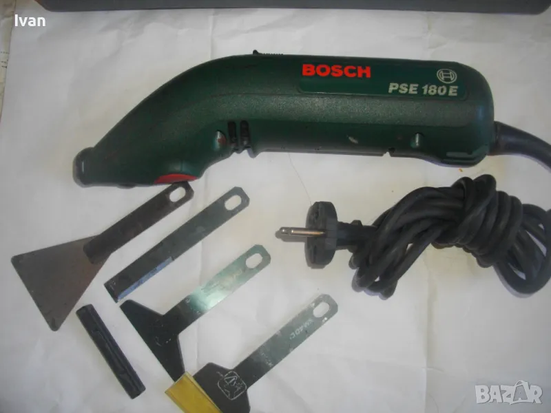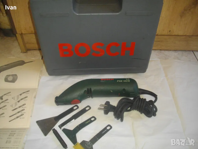 ОПИСАНИЕ на ел. длето машина шабър Бош оригинална швейцарска с 4 бр. различни сменяеми приставки в куфар - цена 299 лв. Марка и модел BOSCH PSE 180E. Оригинало швейцарско произовдство на марката от истинското старо качество - упоменато и маркирано на машината - Made in SWITZERLAND 19997г. 3 степени на скорост. Машината е за стъргане боя, фуги на плочи и други подобни дейности. Запазен външен вид и отлично работно състояние. Мощност - 180 вата, защита 0,85 ампера. Добри ротационни движения и трептения. Приставки - 4 бр. различни, оригинални на Бош. Пакет с книжки указания и техн. скици на машината. Оригинален куфар с фабричното лого на марката. Тегло на комплекта - 3,0 кг. Цена - 299 лв. Разполагам с други различни ел. длета, на по-ниски цени.