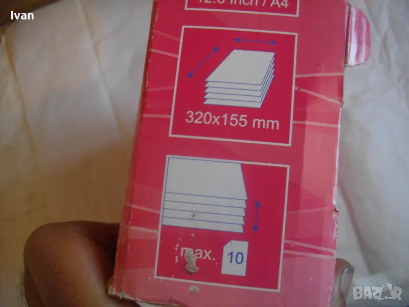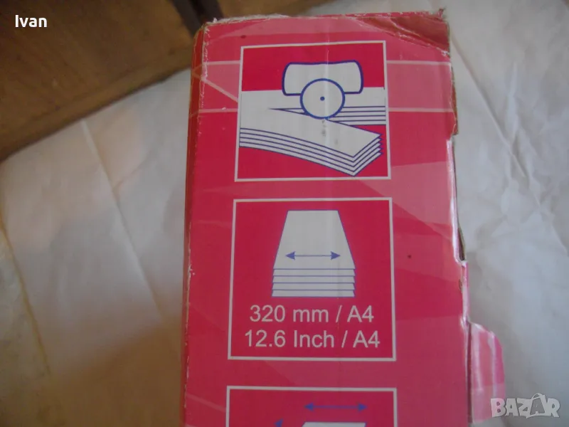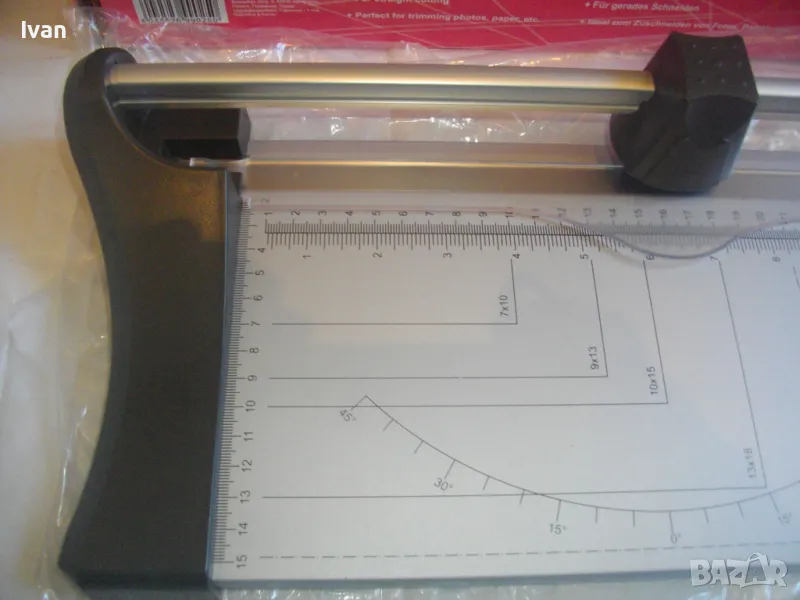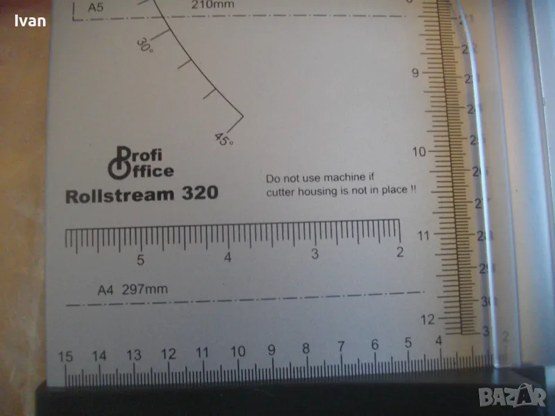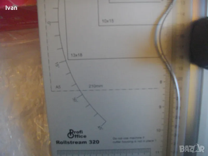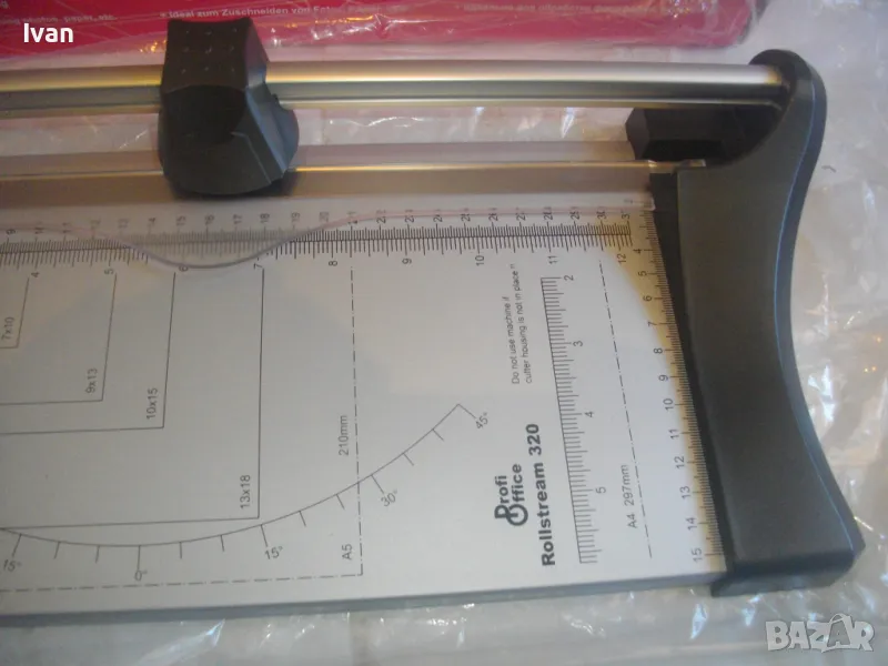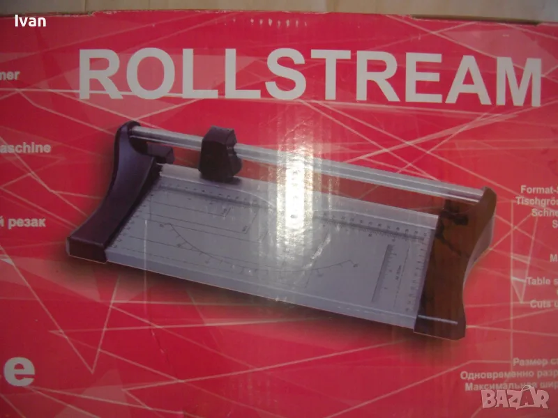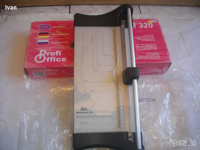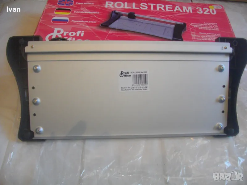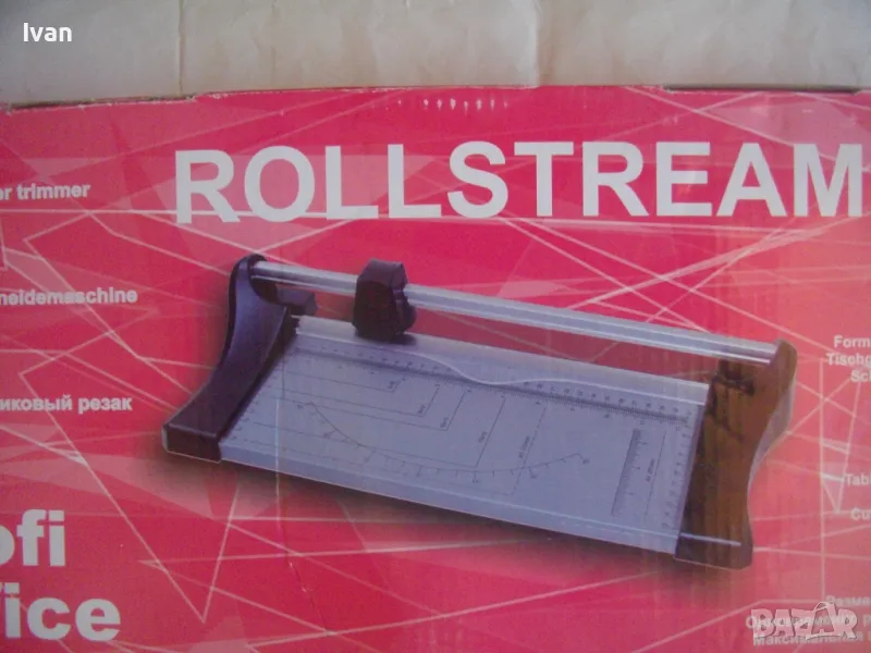 ОПИСАНИЕ на нов ръчен ролков нож за рязане на хартия Rollstream 320 - цена 129 лв. Марка и модел Profi Office ROLLSTREAM 320. Немска марка с производство, базирано в КНР. Съвсем нов, неизползван и неупотребяван. Олекотен дизайн и ергономични размери. Алуминиев плот с пластмасови страници. Разграфена плот долна основа с различните хормати хартия. Размер на таблата плот 320 х 155 мм. За рязане на хартия до 10 листа с 1 поставяне. Рязане по дължина до 320 мм - 12,6 инча. Оригинален кашон. Тегло на машината с кашона - 1,8 кг. Цена 129 лв. Разполагам с други различни нови и ползвани тримери ролкови ножове за рязане хартия табак кадастрон, също и с гилотини, различни марки на различни цени.