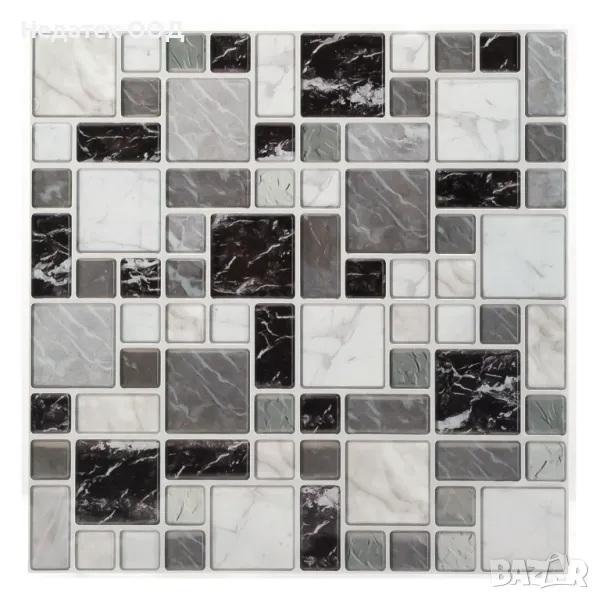 Самозалепваща плочка, мраморен ефект в сиво, бяло и черно. Устойчиви са на температура (60-80ºC) и влажност (80-95%). Прилягат много добре, без да се белят или деформират и се почистват лесно със свежа кърпа.