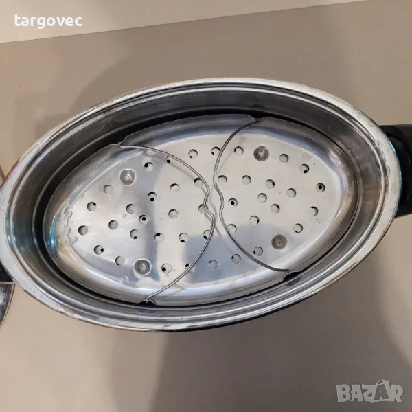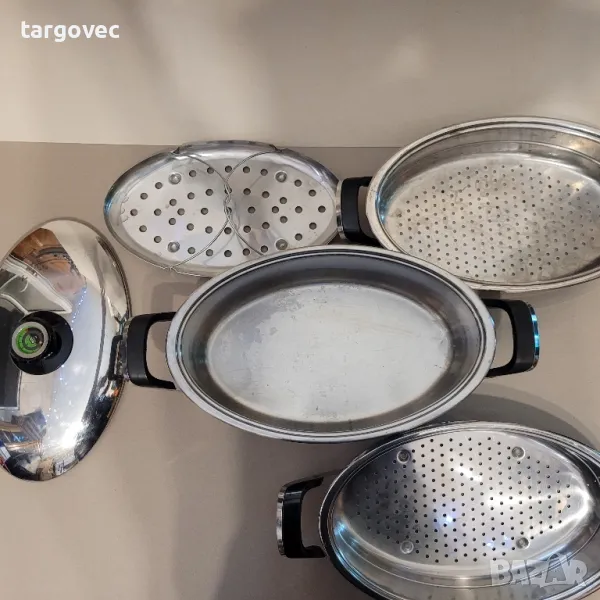 внос Германия изключително масивна три Етажна тенджера с перфорации за готвене на пара комплекта се състои от пет части като има кошница за изваждане която може да бъде използвана във всяко от трите нива най-голяма дължина на тенджерата 45 см с дръжките дължина на основния съд 34 см широчина 20 см изключително масивно дъно за равномерно разпределяне на температурата
